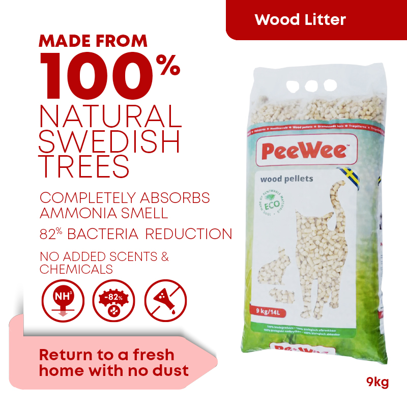 The PeeWee Eco Wood Litter 9kg is specially designed for cats. The wood shavings and pellets don't stick to paws; that's better for your cat and rids your home of soiled cat litter dust! PeeWee wood pellets have the unique characteristic of neutralising the smell of ammonia and absorbing considerably more moisture than any other cat litter on the market − up to 15 times their own volume! One bag of pellets can last for 3-4 months in a single cat household when used with PeeWee litter boxes.