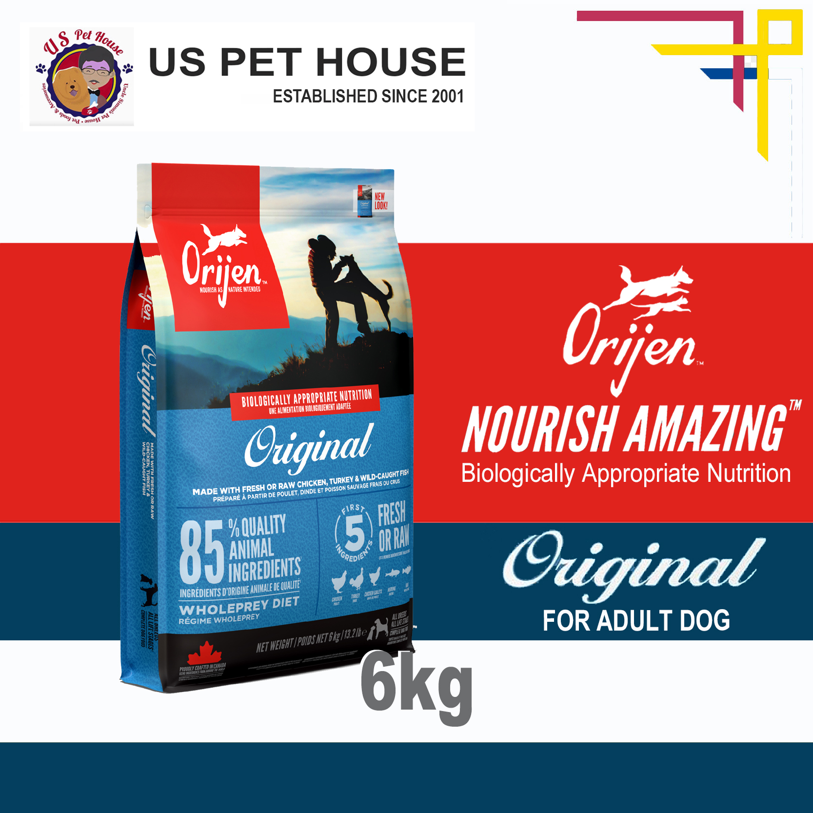 Help your dog thrive with the power of protein-rich recipes that provide peak nourishment. Dogs are ancestral carnivores, so they need a Biologically Appropriate diet rich and varied in whole animal ingredients. ORIJEN®Original diet is packed with 85%1quality animal ingredients like fresh or raw free-run2chicken and turkey, and wild-caught or sustainably farmed fish. Packed with WholePrey animal ingredients like organs and bone, ORIJEN food is made with the most nutrient-dense, succulent parts of the prey to deliver the nutrition dogs need. The result is a diet for your canine companion that is beyond comparison.