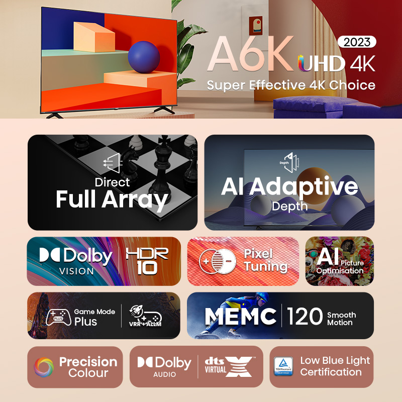 Hisense A6K Smart TV 55 inch | UHD | Direct Full Array | AI Adaptive Depth | Dolby Vision | Dolby Audio | VRR + ALLM | Pixel Tuning | AI Picture Optimisation | MEMC | 120 Smooth Motion | Precision Col
