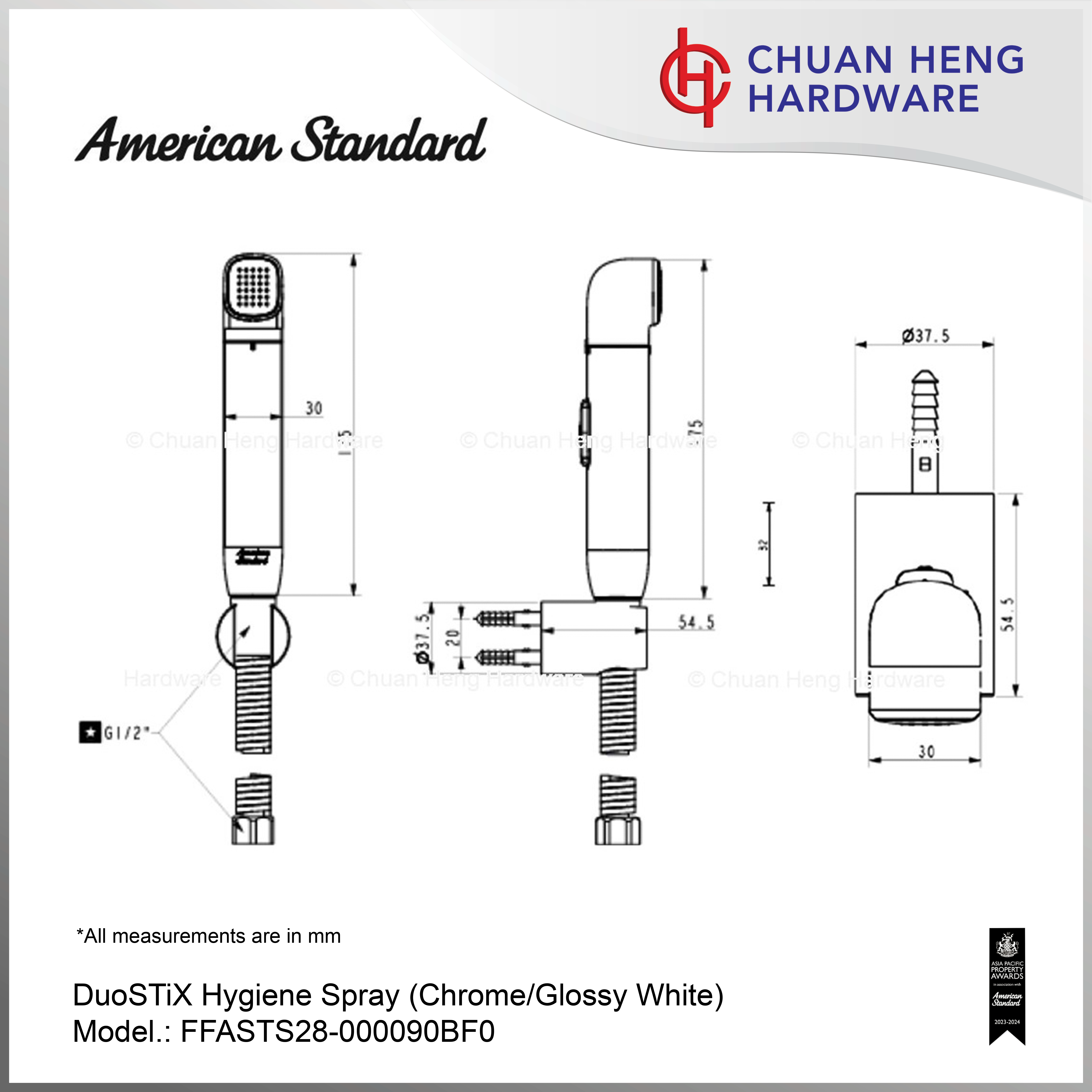 American Standard FFASTS28-000090BF0 Hygiene Spray with Hose and Holder (Chrome & Glossy White)