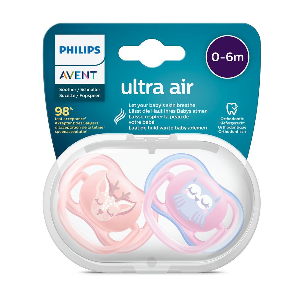 Soothe your baby with a pacifier that lets its skin breathe. The Philips Avent ultra air has extra large holes to keep skin dry. Its lightweight shield is designed for maximum air flow. Available in various colors and designs