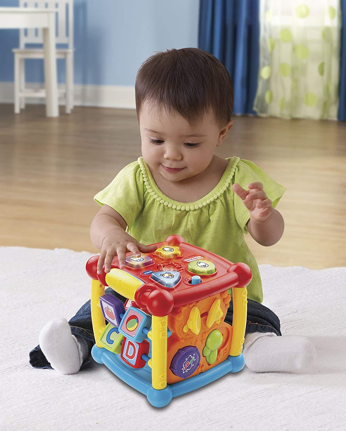 Exploration and fun is around every corner with the Busy Learner’s Activity Cube™ by VTech®. Featuring five sides to explore, this play cube attracts your baby’s attention and encourages imaginative play with music, light-up buttons, colors and more. Shape and animal buttons introduce animal names, animal sounds and shapes. Press and slide musical instrument buttons introduce instrument names, sounds and colors. Sliding, spinning blocks promote interaction and fine motor skill development. This interactive cube also plays fun sounds when it's moved. Plays 25 sing-along songs and melodies.