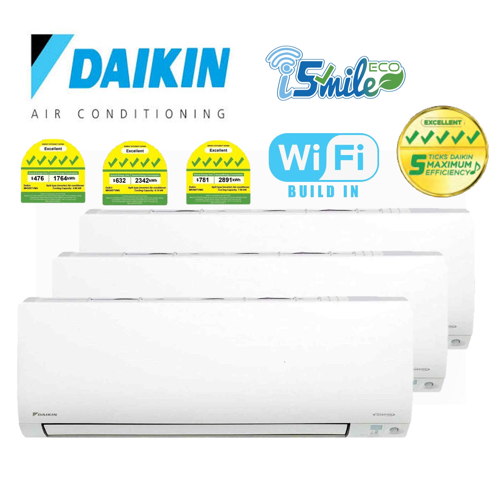 DAIKIN AIR CONDITIONER R32 I-SMILE MULTI-SPLIT INVERTER SYSTEM 3 [MKM50VVMG x 1 & CTKM25VVMG x 3] + FREE 60 MONTH WARRANTY + FREE Delivery + FREE Consultation Service