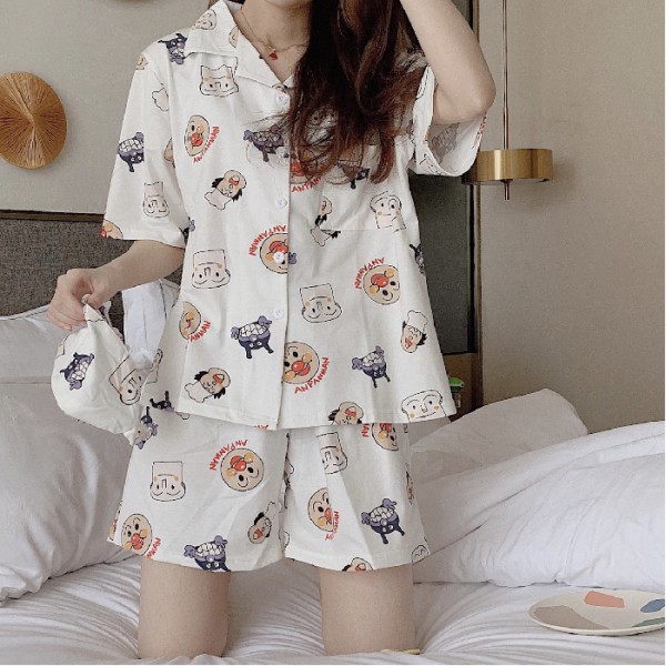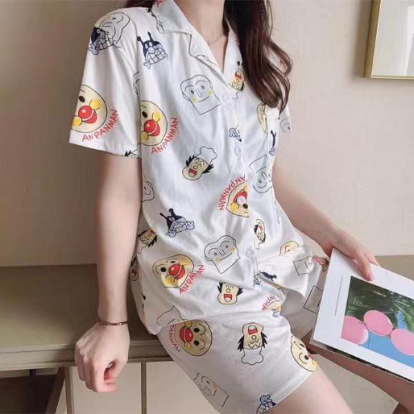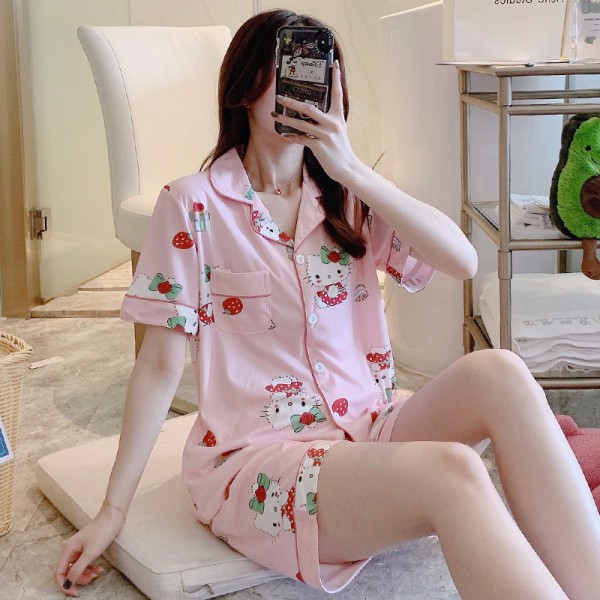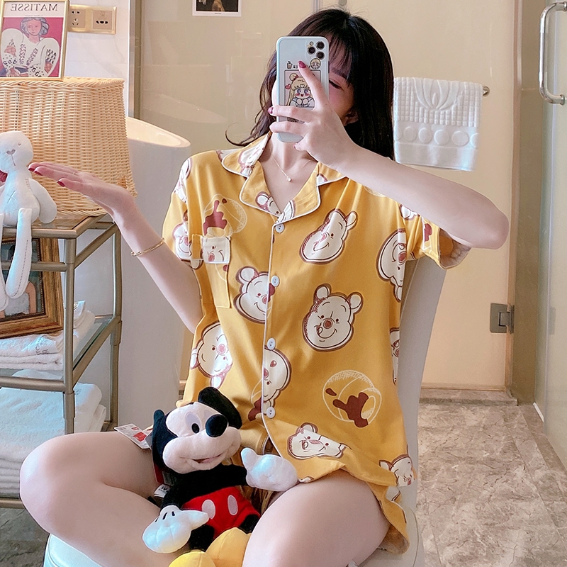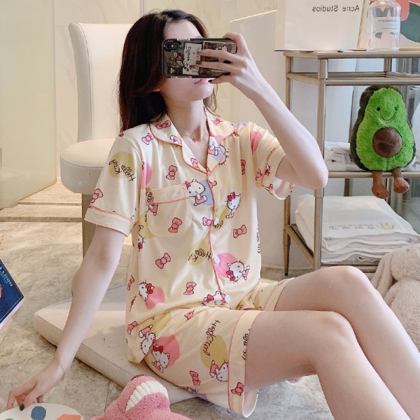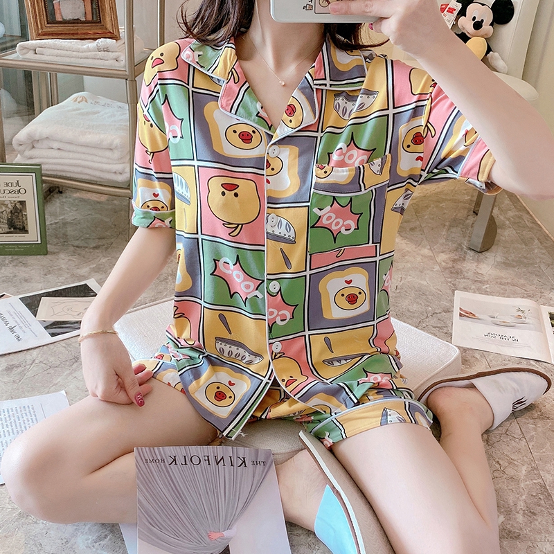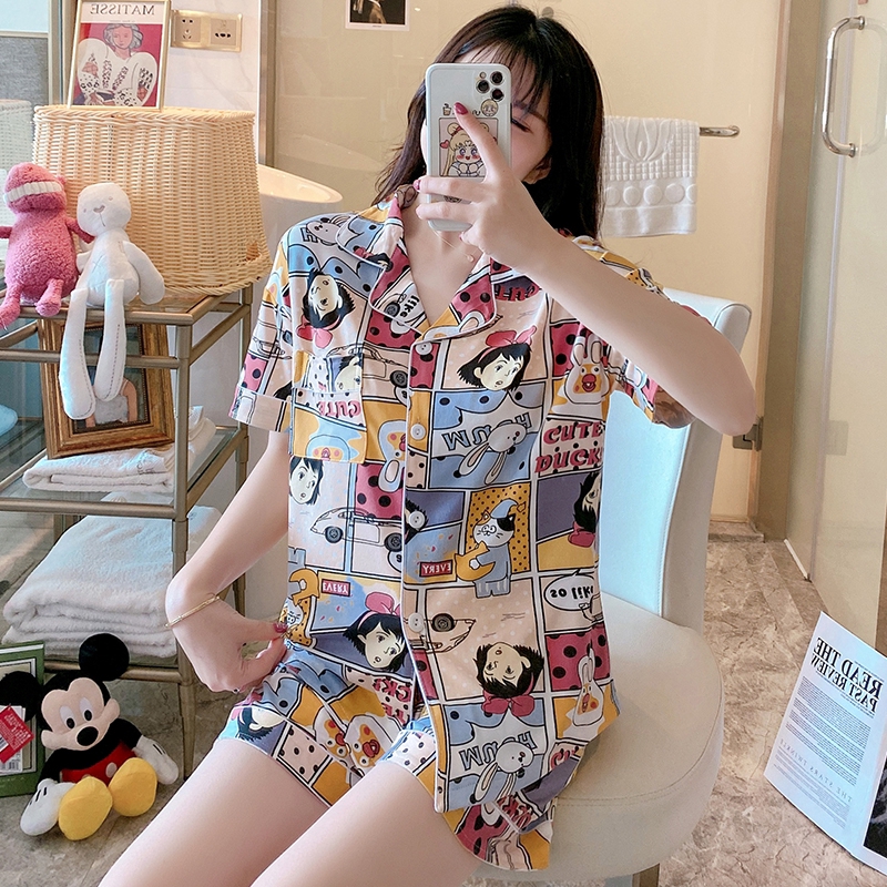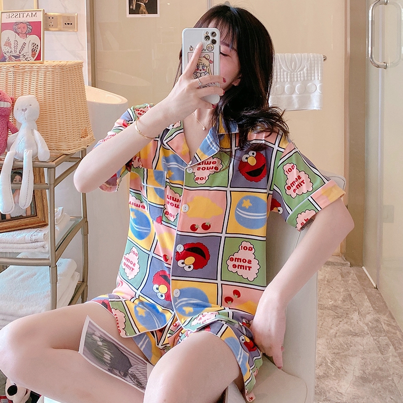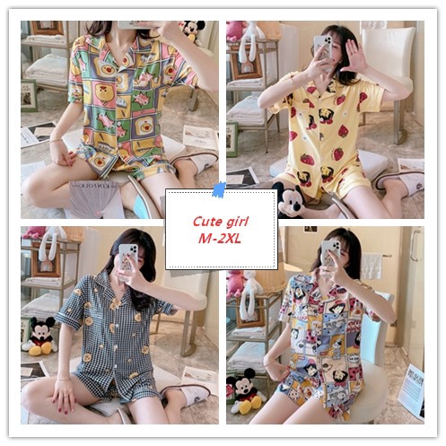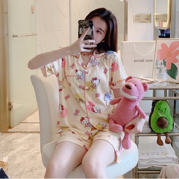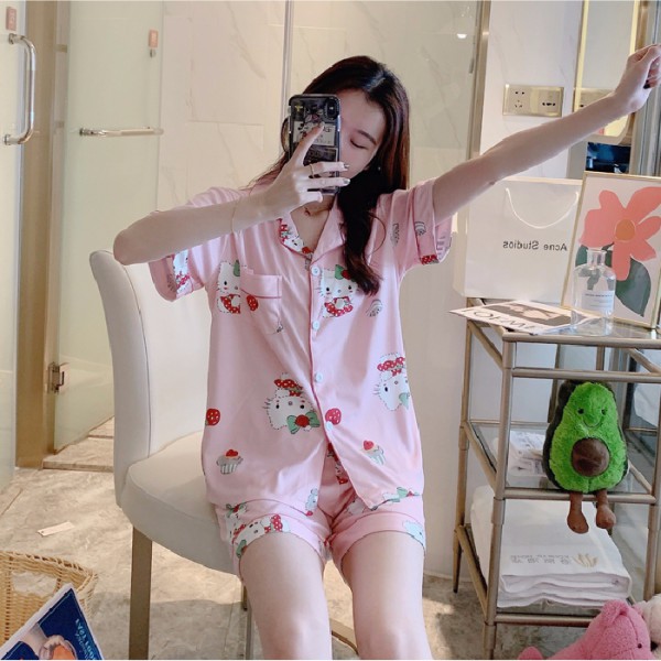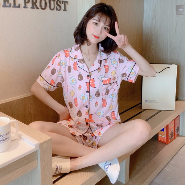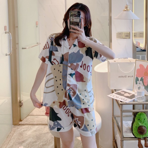 Ready Stock Women Baju Tidur Silk Pyjamas Set Short sleeve shorts Sleepwear Pajamas Fruit Print Nightwear Sleep Suit