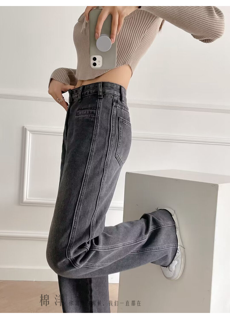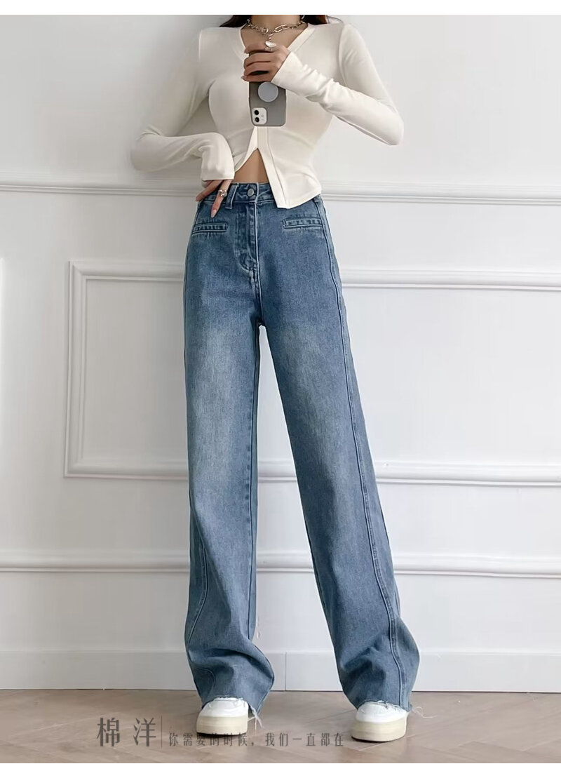 Cotton Ocean European and American Beauty Bloggers Retro High Street Style Loose Pants Patchwork Raw Hem High Waist Straight Mop Denim Trousers for Women