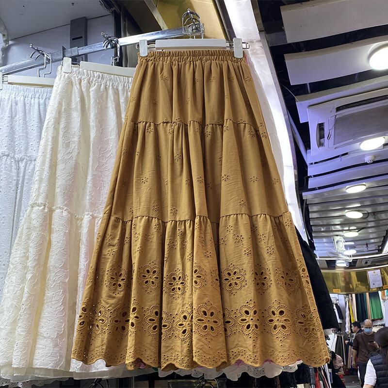 Gentle and All-Match Cut Out Embroidery Pleated Puffy A- line Skirt 2024 Spring and Summer New Arrival Covering Mid-Length Dress 338