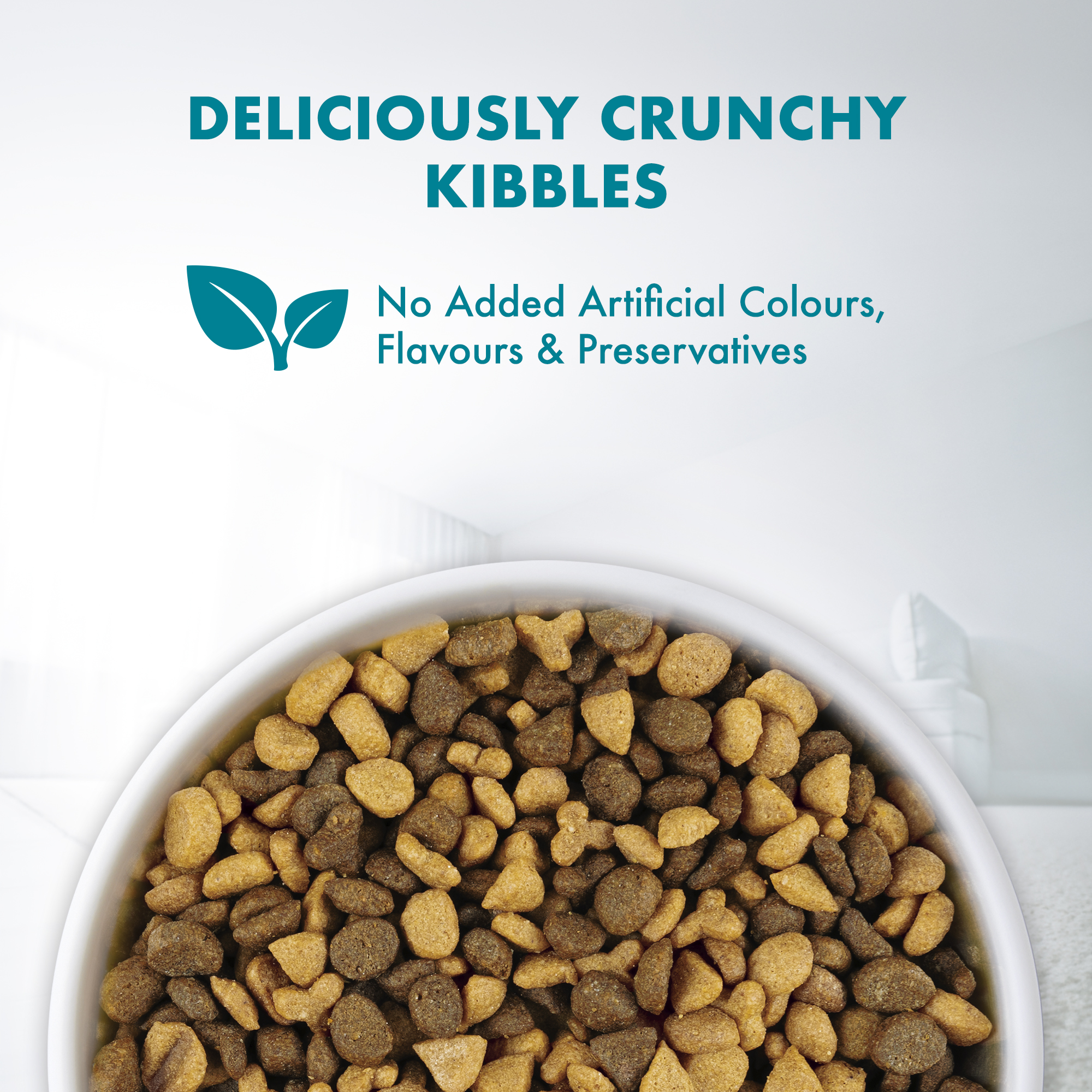 - Crunchy kibble and calcium to support healthy teeth and gums