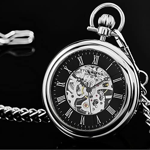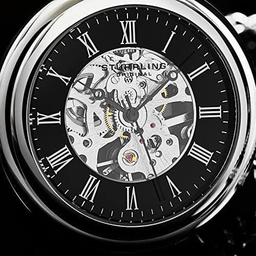 Stuhrling Original Men's Pocket Watch Stainless Steel Analog Skeleton Watch Hand Wind Mechanical Movement Stainless Steel Chain