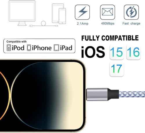 [MFi Certification]Best New Nylon Braided materials and cutting-edge technology ensure a maximum charging speed of up to 2.1A, which is faster than most standard cables. The professional research and development team enables each cable to exceed other people's products in terms of safety during charging. Ultrathin connector heads can be inserted into almost all shell openings. Precise interface design: The nylon braided sheath can protect the cable from knotting and abrasion. Our charger cable has been tested and can be bent 95 degrees and 8000 times. The exquisite metal connector shell head increases the service life and avoids the risk of cracking or other types of fracture. High-quality copper wires can maximize signal quality and increase durability. Sync and charge quickly on the device. Our technical team has conducted thousands of tests to ensure the safety of the durable 8-pin high-speed braided USB sync and charging cable Super compatibility: iPhone 14/13/12/11,14/13/12/11 Pro,14/13/12/11 Pro Max,13/12 Mini, XS MAX, XS, XR, X, 8, 8Plus, 7, 7Plus, 6Plus, 6s Plus, 6s, 6, iPad Air,Air 2, iPad mini,mini 2, mini3, iPad,Airpods,iPod Touch 5th Gen,iPod Nano 7th Gen. Compatible with all operating system devices. High-quality service: All 3 cables have been 100% tested, our team will provide each customer with high-quality service, so that you can buy and use with confidence.