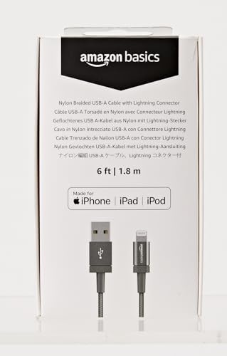 Amazon Basics USB-A to Lightning Charger Cable, Nylon Braided Cord, MFi Certified Charger for Apple iPhone 14 13 12 11 X Xs Pro, Pro Max, Plus, iPad, 6 Foot, Dark Gray