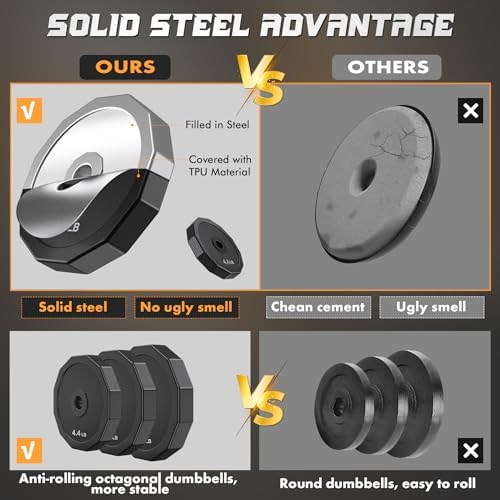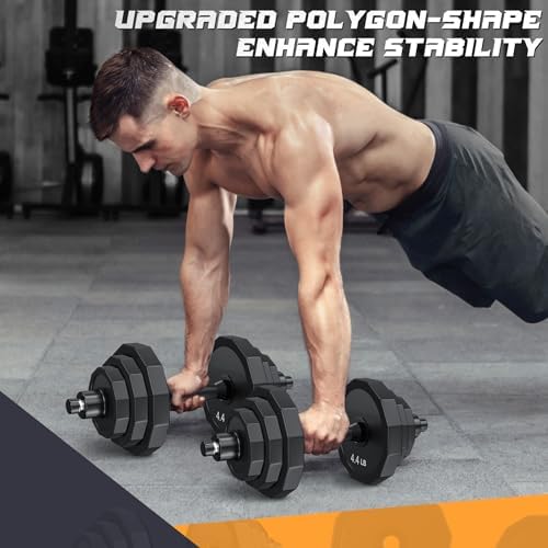 More Adjustable Weights Dumbbells Set Options: With a wide range of weights from 8lbs to 22lbs, these dumbbell set can be assembled as a barbell, allowing you to adjustable your weight to meet your training needs.Fitness dumbbells sets for women men. Upgraded Solid Steel Material with Stable: Compared with the other cement material dumbbells on the market,our adjustable dumbbell set are made of solid steel,thinner,more stable, stable and true weight. Dumbbell weights plate coated is made of TPU material, high security, unbreakable,soundproof and protects the floor. Polygonal design prevents scrolling and makes for easy storage and use.Chrome connecting rod is knurled to ensure a firm grip,while the rubber-coated handle prevents slipping. Perfect for Strength Training: Not limited to workout equipment combinations, this dumbbell weights set comes with a connecting rod and can be assembled as a barbell to improve full-body muscle training. Adjustable design helps fitness enthusiasts increase their strength, burn fat, and shape their bodies.Dumbbells offers a better training way than other home gym equipment. Realize your home gym dreams with just a set of dumbbells. Perfect workout dumbbells gift for men and women. Stable Safety Nuts: The dumbbells adjustable weight includes non-slip fasteners, the thickened nut threads ensure a firm fit with the dumbbell or barbell bar, effectively holding the dumbbell plates in place without worrying about loosening or the plates sliding or falling out, ensuring safe use. Value Package & Brand Support: Our exercise & fitness dumbbells includes 4x 2.2 lbs, 4x 2.8 lbs, 4x 4.4 lbs counterweights, 4x spinlock collars, 2x handles, and 1x knurled chrome connector for a comprehensive workout. KISS GOLD always due to providing our customers with the best service, if you have any questions about our KISS GOLD dumbbells set, please feel free to contact us, we will give you a satisfactory solution within 12 hours.
