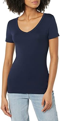 SLIM FIT: Close fit that hugs the body. COTTON MODAL MICRO RIB: Super soft cotton modal micro rib jersey with added stretch offers all-day ease and comfort, while retaining its shape for the perfect slim fit. Fabric you want to live in year round. ESSENTIAL T-SHIRT: This versatile t-shirt is a classic wardrobe essential, perfect layered under your favorite jacket or cardigan or wear on its own styled back to Amazon Essentials Women's Denim and Slip-on Sneakers. DETAILS: Features a classic v-neck and short sleeves for casual and effortless style. #299 in Our Brands ( ) #35 in