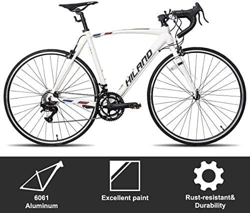 【Lightweight Frame】Hiland road bicycle is designed for people who like to ride or use it for daily commuting. The aluminium frame is lightweight, stiff, more durable and potential for higher speed, supports riders up to 330 pounds. 【Brake System】The brake system consists of double caliper brakes which are lighter ,easier to maintain and longer use time than disc brakes, gives you the stable and strong braking force and help you stop confidently in all conditions. 【Professional Drivetrain】Hiland road bike features 14 speed L-TWOO derailleurs and SHIMANO Shifters, gives diverse riding experience and also ensures total control in every situation, like in gravel, city road or other tough terrain. 【700C Tires】700c wheels have less rolling resistance, make riding more efficient, you can ride further and takes less energy. Wheels with large diameter have better rollover capability, more easily roll over potholes, bumps and other obstacles . 【Assembly&Size Guide】 Size S (50 cm) for women and men between 5'5" & 5'10",Size M (55 cm) for rider between 5'10" & 6'3", Size L (60 cm) for adult between 6'3" & 6'7". 85% pre-assembled, easy to assemble, free installation tools include.