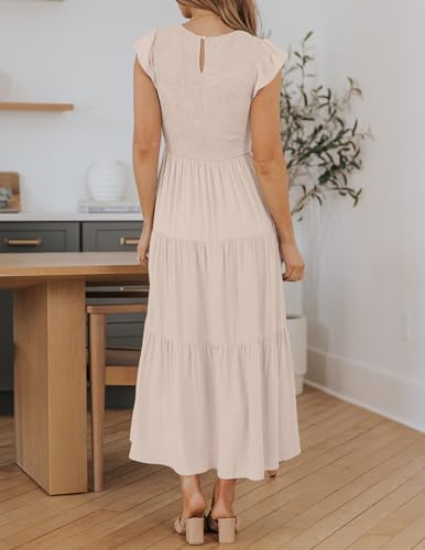 Size Guide: Small/US 4-6, Medium/US 8-10, Large/US 12-14, X-Large/US 16-18. Suggest to iron in low before wearing!! This bold and breezy midi dress has a flattering elastic shirred top, features a crew neck, solid color, high waist, short cap sleeves, edged with playful frills at shoulder, back key-hole closure and a flowy tiered midi skirt, adds more feminine. It's classy, cute and you'll love it. The smocked dress is all things sweet and everything you need! Either the flutter sleeves, ruched bodice or popping colours, will be non-stop talked about. Also can be wear as a maternity dress. This hot-days essential cottagecore dress is perfect for casual, daily, vacation, beach, holiday, wedding, office, family gathering, etc. Just style this with necklace, earrings, heels, wedges, matching clutch and a red lippy. Wash Instruction: Hand/Machine washable with cold water recommended, do not bleach, iron in low, hang or line to dry.