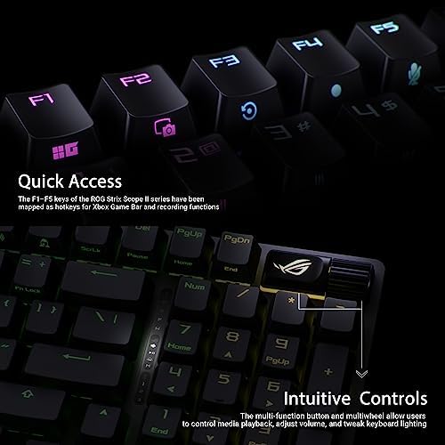 96% layout: Retains all function and number keys in a more compact and efficient layout that frees up desk space Hot-swappable switches: Pre-lubed NX Snow linear switches and ROG NX Storm clicky switches with walled stem design to enhance keystroke stability and are tuned for great acoustics Tri-mode connection: Connect using Bluetooth (up to three devices), 2.4 GHz with ROG SpeedNova wireless technology or wired USB Sound-dampening foam with switch-dampening pads: Unique, integrated dampening foam with added switch-dampening pad structure absorbs pinging noises and echoes for improved keystroke acoustics. Enhanced typing experience: Pre-lubed keyboard stabilizers produce less friction for smoother keystrokes and stability for longer keys; durable ROG PBT doubleshot keycaps or UV-coated ABS keycaps offer a premium feel and shine resistance Hotkeys: F1–F5 keys are pre-programmed as hotkeys for Xbox Game Bar and recording Intuitive controls: Multi-function button and multi-wheel for media playback, volume, and keyboard lighting