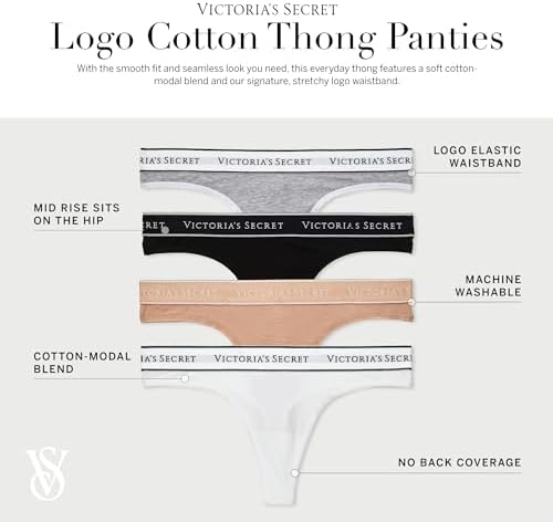Victoria's Secret Cotton Logo Thong Panty Pack, Underwear for Women, 4 Pack, Multicolor (S)