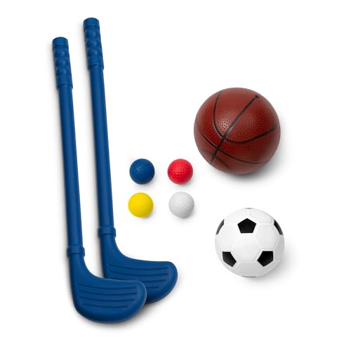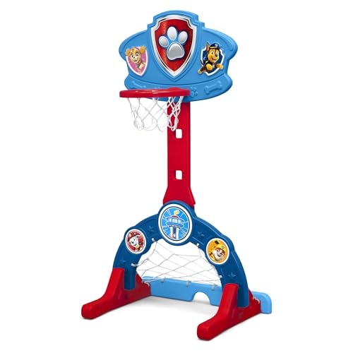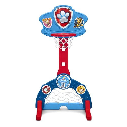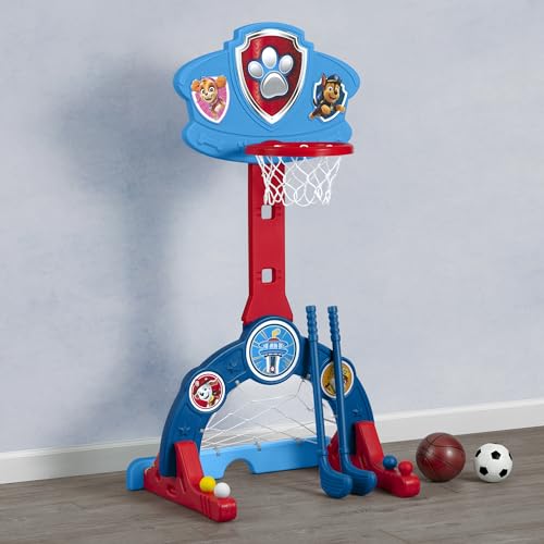4-IN-1 SPORTS CENTER: This sports set provides 4 games to play, so your toddler never gets bored | Choose from basketball, soccer, golf or hockey | Set includes basketball hoop, 1 basketball, 1 soccer ball, 2 golf/hockey clubs, 4 golf/hockey balls HELPS WITH DEVELOPMENT: Kids will work on their gross motor skills as they run, kick and score, plus practice fine motor skills/hand-eye coordination as they control the basketball, soccer ball and golf/hockey clubs ENDLESS FUN: This Sports Center combines exciting games with a bold PAW Patrol design that kids are sure to love | Interactive play will keep kids entertained INDOOR OR OUTDOOR PLAY: Durable plastic construction is ideal for both indoor or outdoor use | Before play, add sand or water to the base for stability PERFECT SIZE: Assembled dimensions: 27.75”W x 21.25”D x 51.38”H (tallest setting) | Recommended for ages 2 years+ | Basketball hoop is adjustable between 40.35 inches and 51.38 inches in height to accommodate all ages and skill levels