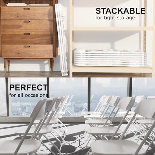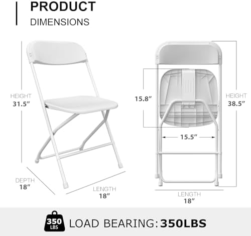 SET OF 10 FOLDING CHAIRS: Multipurpose 10-pack of white folding chairs are an indoor seating solution for banquets, gatherings, and dining - stylish, durable, and versatile. DESIGN FOR LONG-TERM USE: The seat and back are made of thick HDPE, environmental and enough thick. The strong frame is with white coated, beautiful as well as stable. Weight capacity 350lbs. This chair will complement any decor it's steel frame means it will remain durable for years of use. COMFORTABLE SEAT: Ergonomically designed folding chairs can give your back strong support and relief spinal pressure. ANTISKID RUBBER FEET: Rubber feet keeps floor from damaging and help to keep the seat in place while minimizing scuffing. Our plastic folding chairs is quite suitable for your workstation to entertain your guests, which is also a good choice for parties and events in order to treat a large number of people. PORTABLE LIGHTWEIGHT CHAIRS: No assemble needed, simply fold and unfold. Easy to open and close with seconds.They can be easily folded and stored away when not in use, saving you valuable space.