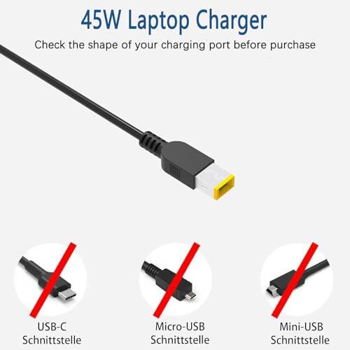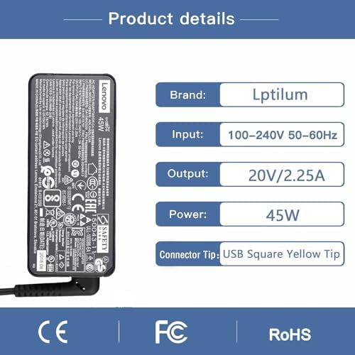 ✅ Output: 20V, 2.25A, 45W; Input:100-240V ~ 50/60 Hz; Connector Tip: USB Square Yellow Tip. (Not USB C Charging Tip !! Please Check Before Purchase) ✅ Laptop Charger for Lenovo Thinkpad: X240, X240S, X250, X260, X270, B40, B50, B40-30, B40-80, B50-30, B50-35, B50-45, B50-70, B50-80; T430, T431S, T440, T440P, T440S, T450, T450S, T460, T460S, T470, T470S, T540P, T550, T560, T570; E431, E440, E450, E455, E460, E465, E470, E475, E531, E540, E550, E551, E550C, E555, E560, E565, E570, E575; G400, G400S, G405S, G410, G410S, G500, G500S, G505, G505S, G510, G510S. ✅ Compatible for Lenovo Thinkpad: L440, L450, L460, L470, L540, L560, L570, S405, S410, S410P, S431, S440, S500, S510p, S531, S540; G40, G50, G51, G70, G40-70, G40-80, G50-30, G50-45, G50-70, G50-80, G51-35, G70-35, G70-80; Z40, Z40-70, Z40-75, Z41, Z41-70, Z50, Z50-70, Z50-75, Z51, Z51-70, Z410, Z505, Z510. ✅ Compatible P/N: ADLX45DLC2A, ADLX45DLC3A, ADLX45NCC2A, ADLX45NCC3A, ADLX45NDC2A, ADLX45NDC3A, ADLX45NLC2A, ADLX45NLC3A, 0C19868, 0A36258, 0B47455, 0B47481, 0B47030, 0B47036, 0B47037, 0B47040, 36200245, 45N0289, 45N0290, PA-1650-72. ✅ Compatible for Lenovo ThinkPad Helix 11.6 i5-3337U, i5-3427U, i7-3667U Series; ThinkPad Helix (3698), 3698-4UU, 3698-4PU, 3698-4NU, 3698-4SU, 3698-4RU, 3698-4MU, 3698-4LU, 3698-4KU; Lenovo V110 v110-15isk Y50-70 G700 W540 G500 Z50 B50 g505 g505s z50-70 z70-80 z51 g710 s20-30; Chromebook N20 N20p 11e X150E; Edge 15 Edge 2 15 1580; IdeaPad Yoga 2 11 2 13 2 Pro 11 11S 13 500.